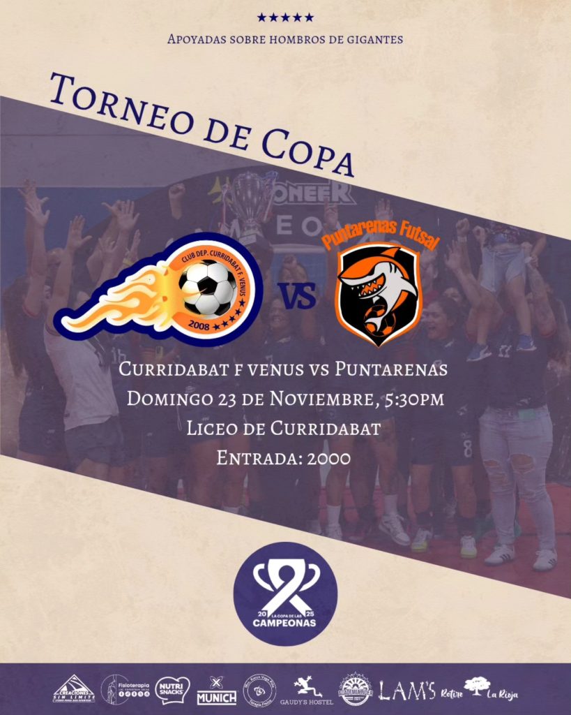 El equipo de futsal femenino Curridabat F Venus conoció el pasado lunes 17 su rival para los cuartos de final de la Copa de las Campeonas 2025. Las curridabatenses se enfrentarán al conjunto de Puntarenas Futsal el próximo 23 de noviembre a las 5:30 p.m., en el gimnasio del Liceo de Curridabat.