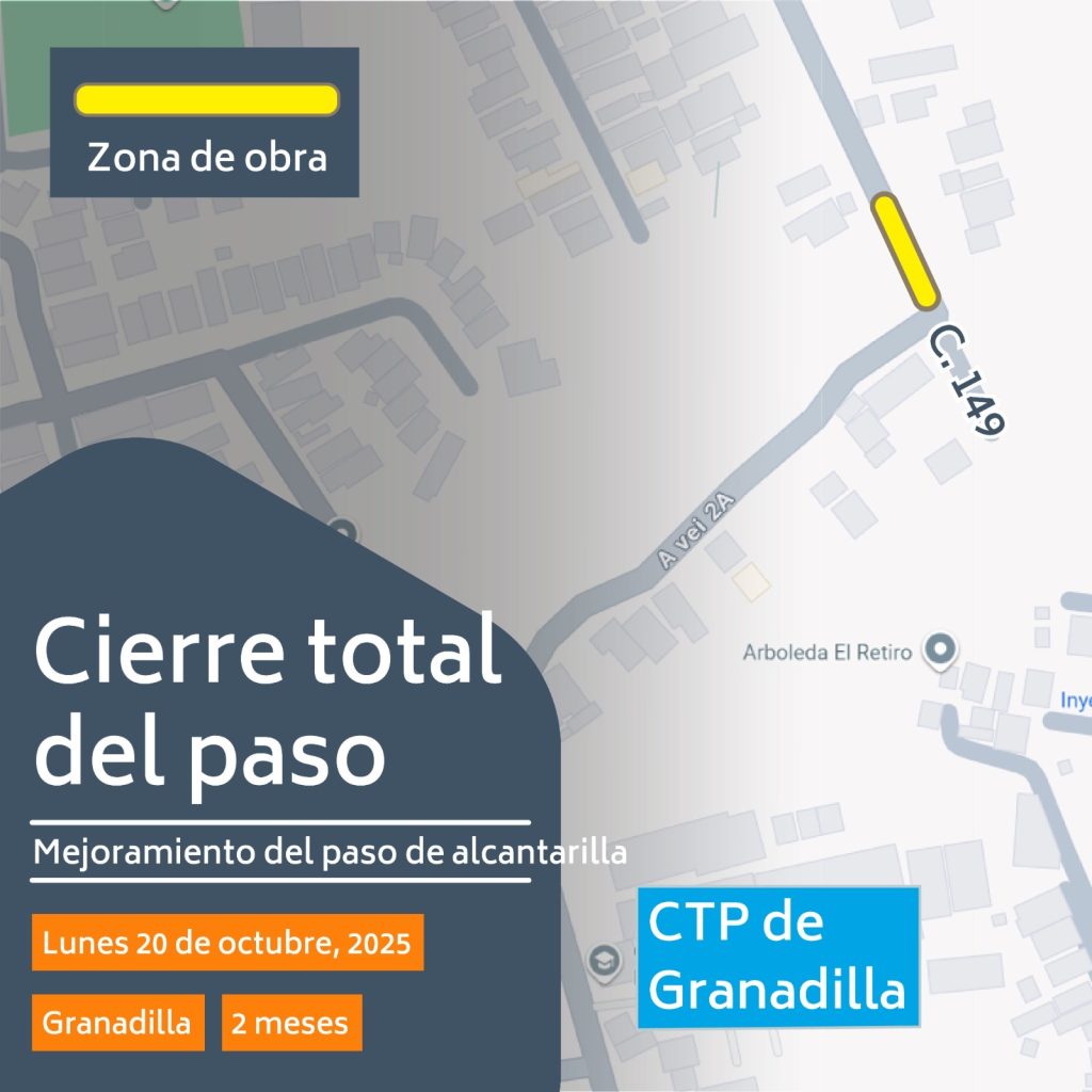 La Municipalidad de Curridabat informó que a partir del lunes 20 de octubre de 2025 iniciarán las obras de mejoramiento sobre la Calle Chanto (Calle 149), ubicada aproximadamente 350 metros al noreste del Colegio Técnico Profesional de Granadilla.