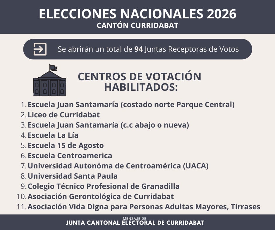 El cantón de Curridabat contará con 94 juntas receptoras de votos (JRV) distribuidas en 11 centros de votación para las elecciones nacionales de 2026, según información oficial suministrada por la Junta Cantonal Electoral de Curridabat.