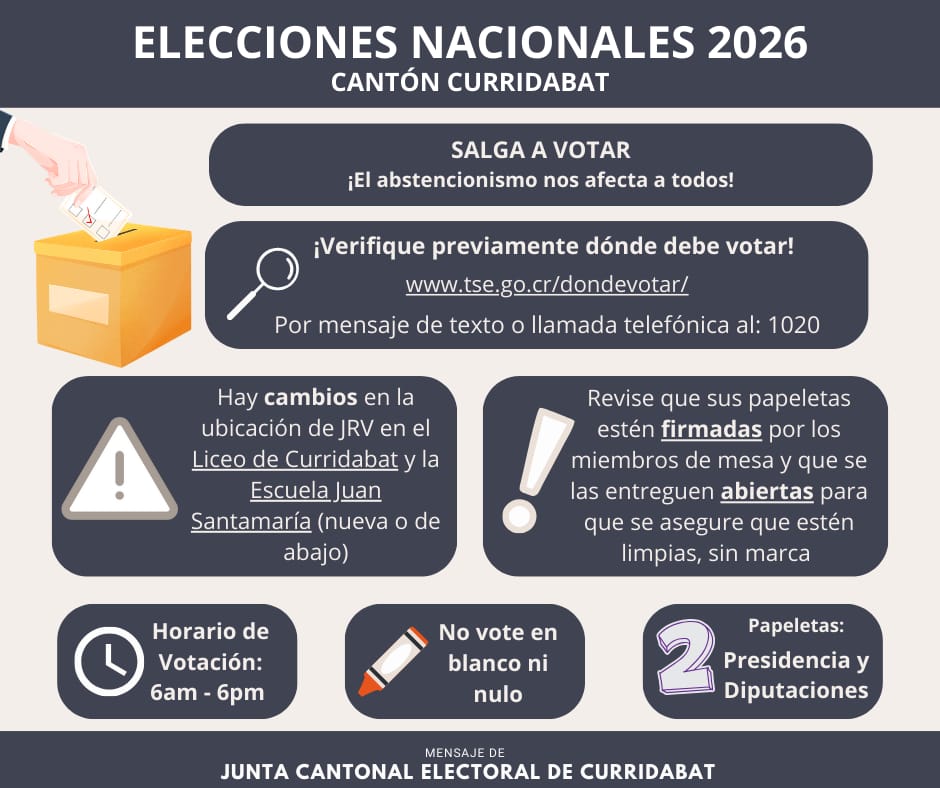 El Tribunal Supremo de Elecciones recuerda a la ciudadanía la importancia de verificar previamente el lugar de votación, ya que se reportan cambios en la ubicación de algunas juntas receptoras, particularmente en el Liceo de Curridabat y en la Escuela Juan Santamaría (sede nueva o de abajo).