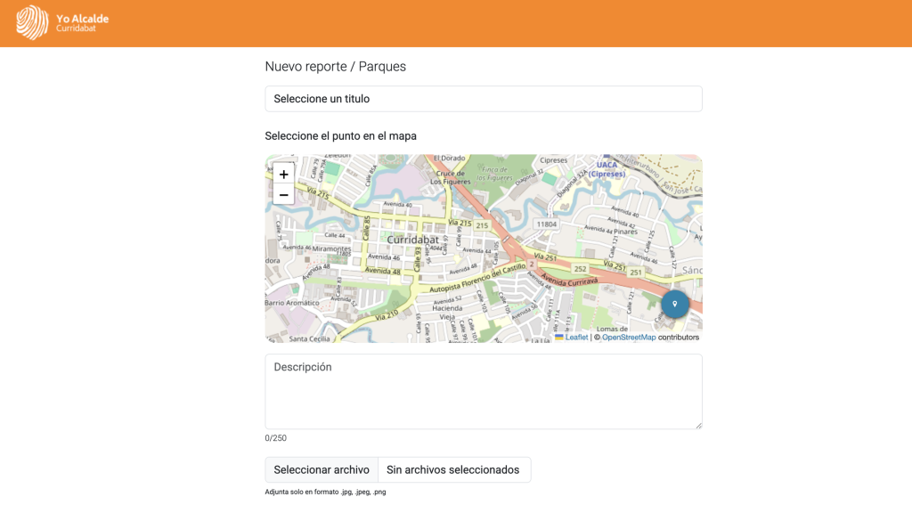 Para generar un reporte, el usuario debe incluir un título, ubicar en el mapa el punto donde se presenta la situación, añadir una descripción y adjuntar imágenes en formato JPG, JPEG o PNG.